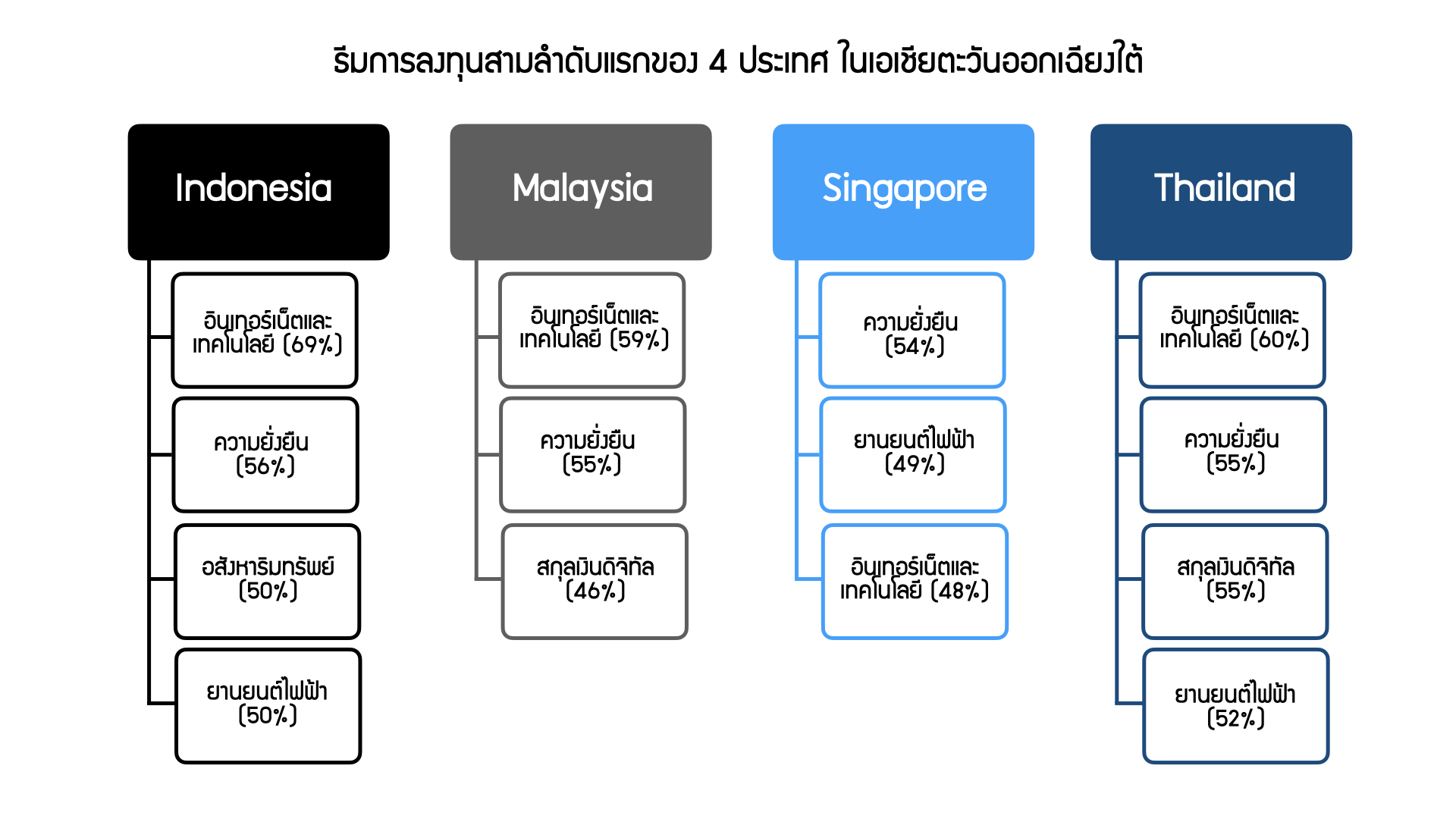 การมองหาธีมการลงทุนกำลังเติบโตขึ้นในหมู่นักลงทุนทั้งหลาย โดยนักลงทุนไทยจำนวน 60% (เทียบกับ 58% ในเอเชียตะวันออกเฉียงใต้ และ 57% ทั่วโลก) ให้ความสำคัญกับการจัดสรรการลงทุนในกลุ่มเทคโนโลยี ในทำนองเดียวกัน ความยั่งยืนก็ยังคงเป็นธีมการลงทุนที่สำคัญ