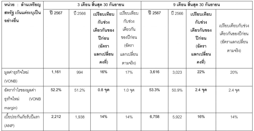 โดยรวมแล้ว เบี้ยประกันภัยรับปีแรก (ANP) สำหรับกลุ่มบริษัทเติบโตขึ้นร้อยละ 14 เป็น 2,212 ล้านเหรียญสหรัฐในไตรมาสที่สามของปี 2567 อัตรากำไรของมูลค่าธุรกิจใหม่ (VONB Margin) เพิ่มขึ้น 0.8 จุดเมื่อเทียบเป็นรายปี และยังคงแข็งแกร่งที่ร้อยละ 52.2 อัตรากำไรที่รายงานตามมูลค่าปัจจุบันของเบี้ยประกันภัยธุรกิจใหม่ (PVNBP) ยังคงมีเสถียรภาพเมื่อเทียบกับช่วงครึ่งแรกของปี 2567 ในขณะที่เบี้ยประกันภัยรับรวม (TWPI) เพิ่มขึ้นร้อยละ 9 เป็น 10,301 ล้านเหรียญสหรัฐในไตรมาสที่สาม