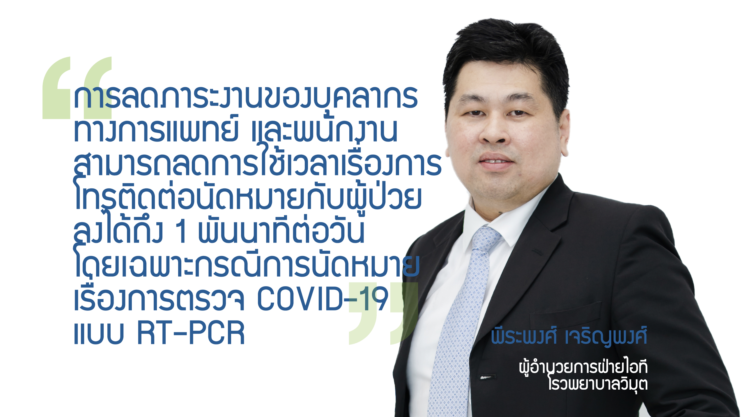 พีระพงศ์ เจริญพงศ์ ผู้อำนวยการฝ่ายไอที อธิบายว่า “โรงพยาบาลวิมุต เห็นผลลัพธ์ตามที่เป้าหมายที่ตั้งไว้อย่างชัดเจน เริ่มจาก การลดภาระงานของบุคลากรทางการแพทย์และพนักงาน สามารถลดการใช้เวลาเรื่องการโทรติดต่อนัดหมายกับผู้ป่วยลงได้ถึง 1 พันนาทีต่อวัน โดยเฉพาะกรณีการนัดหมายเรื่องการตรวจ COVID-19 แบบ RT-PCR”