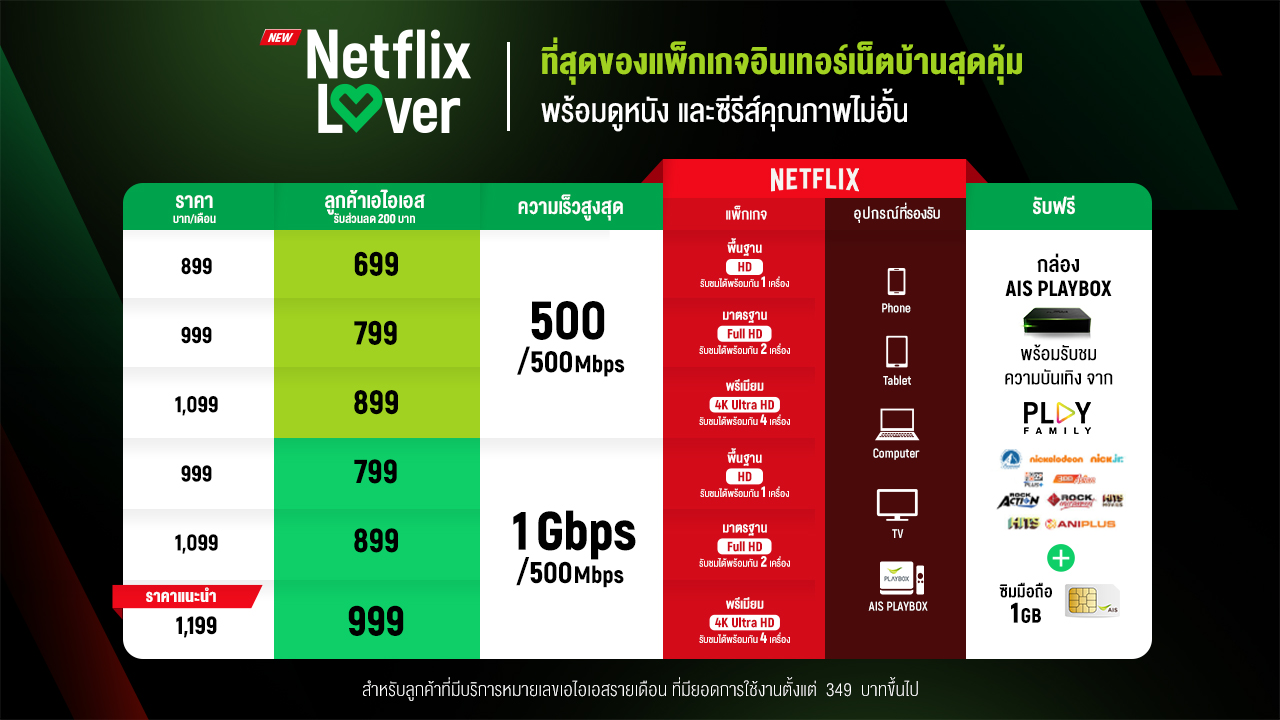 สำหรับแพ็กเกจ Netflix_Lover เป็นแพ็กเกจพิเศษที่ลูกค้าจะได้รับเน็ตบ้านพร้อม Netflix โดยเริ่มต้นที่ความเร็วระดับ 500/500 Mbps และความเร็วสูงสุด 1Gbps/500 Mbps สามารถรับชมคอนเทนต์ความบันเทิงจากสตรีมมิ่งแพลตฟอร์มอย่าง Netflix ได้แบบจัดเต็มพร้อมสัมผัสประสบการณ์รับชมด้วยคุณภาพระดับ 4K และสามารถรับชมพร้อมกันได้สูงสุดถึง 4 อุปกรณ์ บนกล่อง AIS PLAYBOX