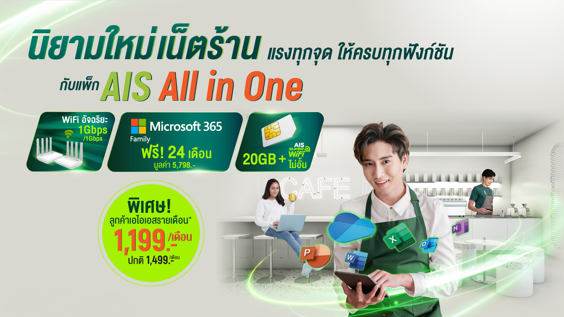 แพ็กเกจ AIS All in One เป็นแพ็กเกจที่ให้อินเทอร์เน็ตร้านความเร็วสูง มีฟังก์ชันครบทุกการใช้งาน ด้วย AI Router ถึง 2 ตัว พร้อม SIM Net 20 GB และไลเซนส์ใช้งานซอฟต์แวร์ Microsoft 365 Family ที่ใช้งานได้สูงสุด 6 ผู้ใช้งาน พร้อม One Drive 1TB ต่อผู้ใช้งาน