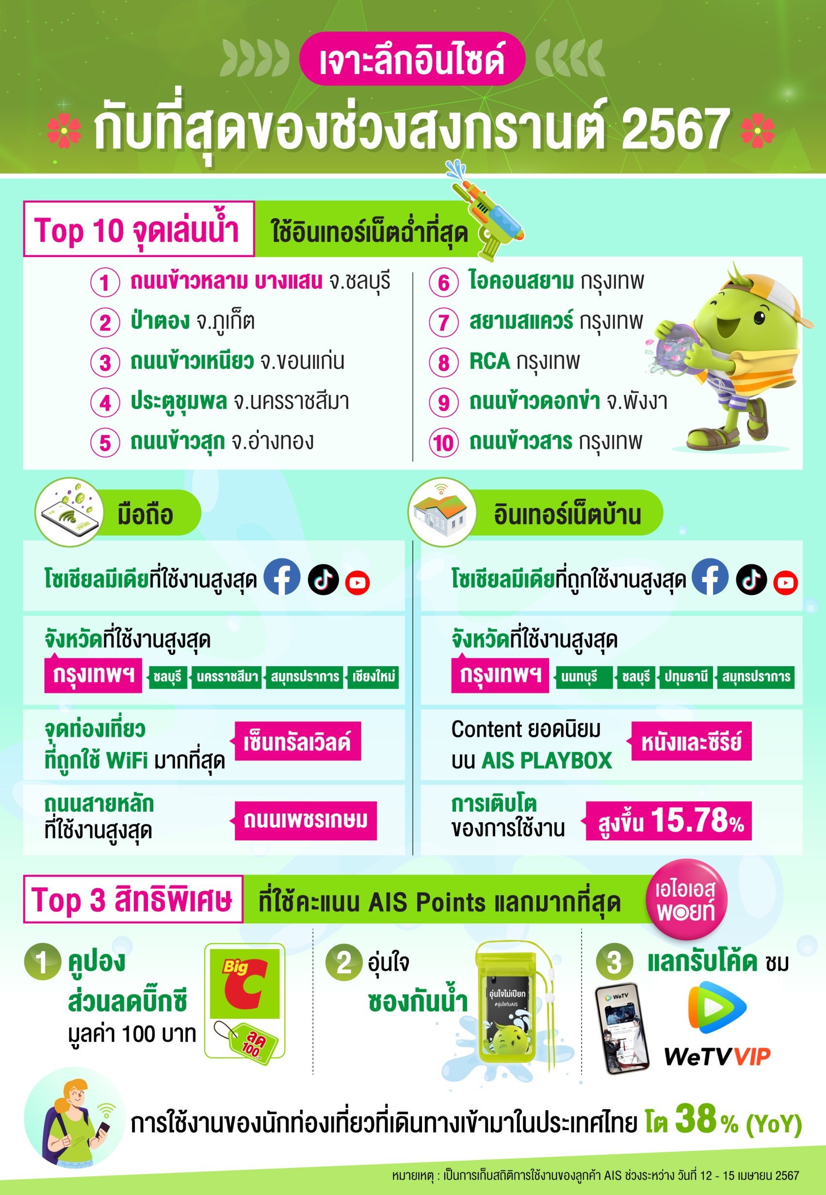 โดยจากการเก็บข้อมูลพฤติกรรมการใช้งานตั้งแต่วันที่ 12-15 เมษายน 2567 AIS พบข้อมูลที่น่าสนใจอีกหลายประเด็น อาทิ