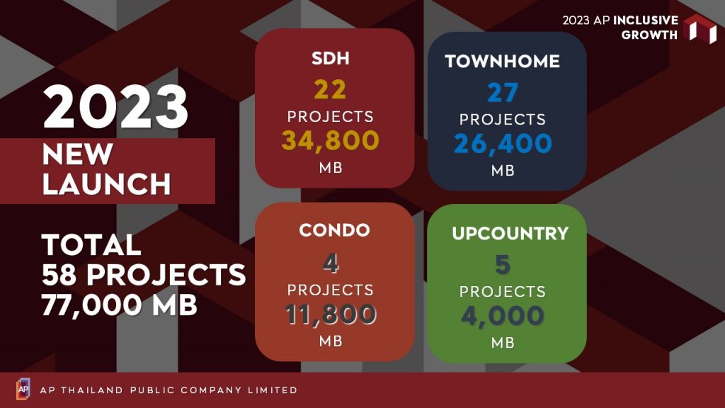 บมจ.เอพี ไทยแลนด์ มีแผนพัฒนาโครงการใหม่ในปี 2566 รวมทั้งสิ้นจำนวน 58 โครงการ มูลค่าประมาณ 77,000 ล้านบาท ซึ่งแบ่งเป็นบ้านเดี่ยว 22 โครงการ มูลค่า 34,800 ล้านบาท ทาวน์โฮม 27 โครงการมูลค่า 26,400 ล้านบาท คอนโดมิเนียม 4 โครงการ มูลค่า 11,800 ล้านบาท และโครงการในต่างจังหวัด 5 โครงการ มูลค่า 4,000 ล้านบาท โดยตั้งเป้ายอดขาย 58,000 ล้านบาท เป้ารายได้รวม 100% JV ที่ 57,500 ล้านบาท