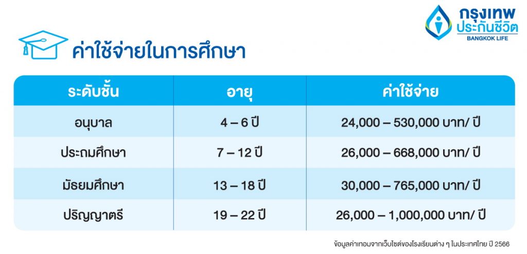 โดยพบว่า *ค่าใช้จ่ายสำหรับการศึกษาชั้นอนุบาล อายุ 4 – 6 ปี จะอยู่ระหว่าง 24,000 – 530,000 บาท/ ปี, ชั้นประถม อายุ 7 – 12 ปี จะอยู่ระหว่าง 26,000 – 668,000 บาท/ ปี , ชั้นมัธยม อายุ 13 – 18 ปี จะอยู่ระหว่าง 30,000 – 765,000 บาท/ ปี และระดับชั้นปริญญา อายุ 19– 22 ปี จะอยู่ระหว่าง 26,000 – 1,000,000 บาท/ ปี (*ข้อมูลค่าเทอมจากเว็บไซต์ของโรงเรียนต่าง ๆ ในประเทศไทย ปี 2566)