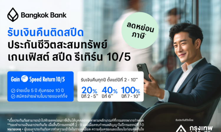 ประกันชีวิตสะสมทรัพย์ “เกนเฟิสต์ สปีด รีเทิร์น 10/5” ออกแบบให้เป็นเครื่องมือออมเงินระยะยาวที่ให้ผลตอบแทนแบบขั้นบันได ด้วยผลประโยชน์เงินคืนระหว่างสัญญาตั้งแต่ปีที่ 2 – ปีที่ 10 โดยปีที่ 2-5 รับเงินคืน 20%* ปีที่ 6 รับเงินคืน 40%* และปีที่ 7-10 รับเงินคืน 100%* รับผลประโยชน์รวมตลอดสัญญาสูงสุด 520%* ช่วยบริหารสภาพคล่องและสร้างแรงจูงใจในการออมอย่างมีวินัย โดยผู้ทำประกันชำระเบี้ยเพียง 5 ปี แต่ได้รับความคุ้มครองเต็มสัญญา 10 ปี ลดหย่อนภาษีสูงสุด 100,000 บาท รับประกันชีวิตโดยกรุงเทพประกันชีวิต สมัครผ่านโมบายแบงก์กิ้ง ธนาคารกรุงเทพ