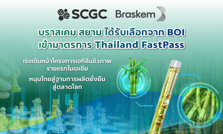 บราสเคม สยาม บริษัทร่วมทุนใน SCGC และ Braskem ได้รับเลือกจากบีโอไอเข้ามาตรการ Thailand FastPass เร่งเดินหน้าโครงการเอทิลีนชีวภาพรายแรกในเอเชีย  หนุนไทยสู่ฐานการผลิตยั่งยืนสู่ตลาดโลก