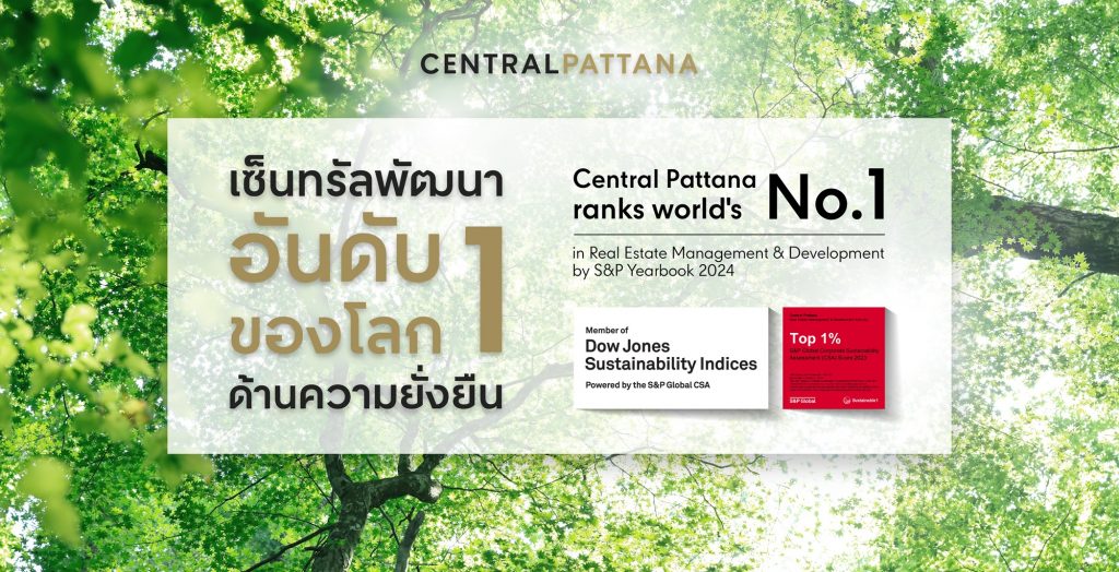 บริษัท เซ็นทรัลพัฒนา จำกัด (มหาชน) ตอกย้ำความแข็งแกร่ง ขึ้นแท่นเบอร์ 1 องค์กรยั่งยืนระดับโลก ได้รับคัดเลือกให้เป็นสมาชิกของดัชนีความยั่งยืนดาวโจนส์ (Dow Jones Sustainability Indices: DJSI) สูงสุดเป็นอันดับ 1 ระดับโลก ในกลุ่มอุตสาหกรรมบริหารจัดการอสังหาริมทรัพย์ (Real Estate Management & Development) จากการประกาศผล Sustainability Yearbook 2024