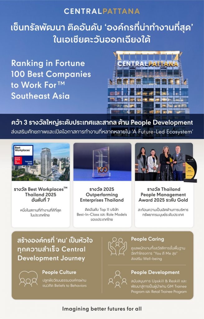 “เซ็นทรัลพัฒนา ติดอันดับ “องค์กรที่น่าทำงานที่สุด” ในเอเชียตะวันออกเฉียงใต้ Fortune 100 Best Companies to Work For™ Southeast Asia พร้อมคว้า 3 รางวัลใหญ่ด้าน People Development ระดับประเทศและสากล