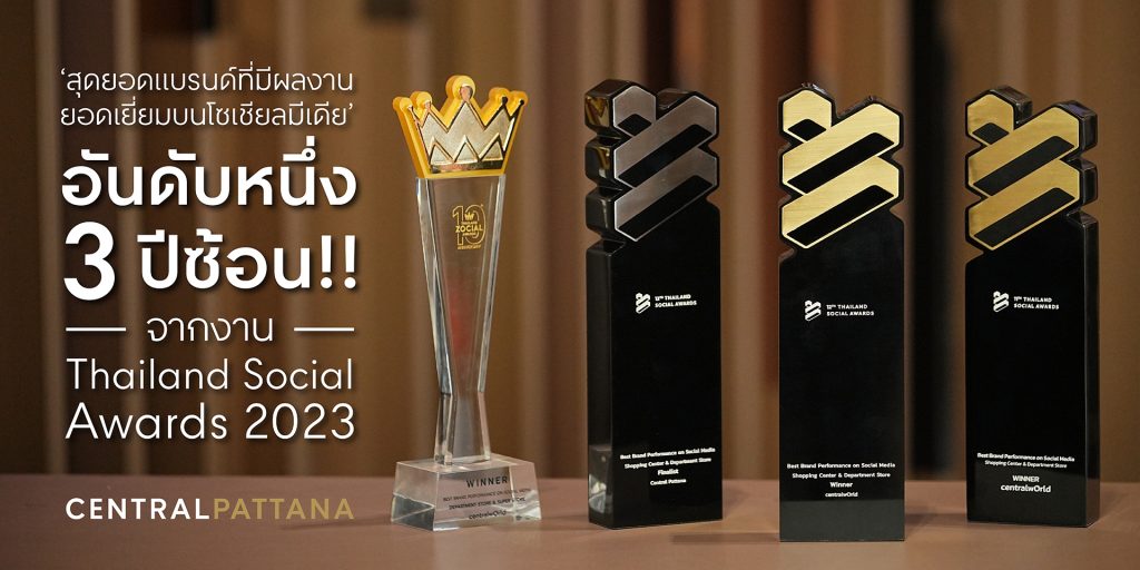 ล่าสุดประกาศความสำเร็จ คว้ารางวัลชนะเลิศ 3 ปีซ้อน Best Brand Performance on Social Media สุดยอดแบรนด์ที่มีผลงานยอดเยี่ยมบนโซเชียลมีเดีย สาขา Shopping Center & Department Store เสริมแกร่งด้วย เซ็นทรัลพัฒนา ผู้นำอสังหาริมทรัพย์ที่ 1 องค์กรยั่งยืนระดับโลก