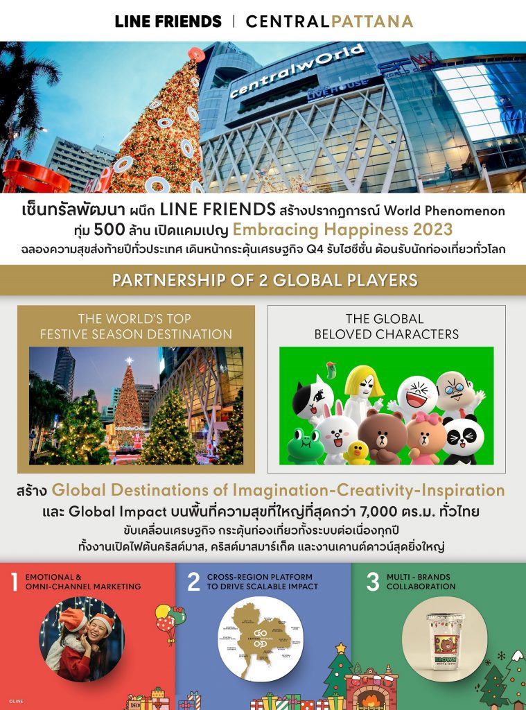 บริษัท เซ็นทรัลพัฒนา จำกัด (มหาชน) ผู้นำอสังหาริมทรัพย์ของไทยในรูปแบบ Retail-led mixed use ได้แก่ ธุรกิจศูนย์การค้าเซ็นทรัล, ที่พักอาศัย, อาคารสำนักงาน และโรงแรมทั่วประเทศ ผนึก LINE FRIENDS คาแรคเตอร์ชื่อดังที่เป็นที่นิยมทั่วโลก สร้างปรากฏการณ์ World phenomenon ทุ่มงบ 500 ล้านบาท เปิดแคมเปญ ‘Embracing Happiness 2023’