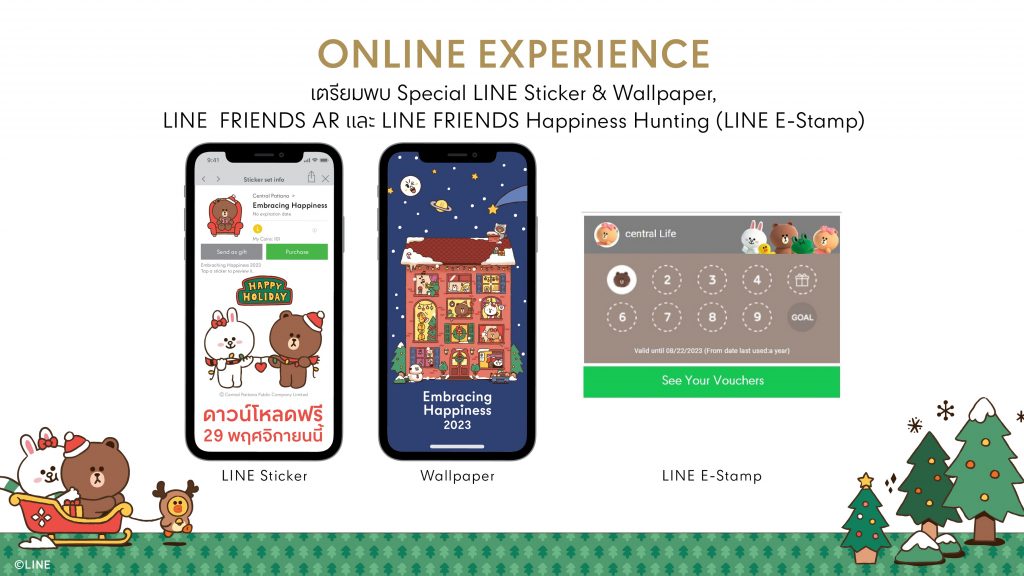 • Online experience กับ LINE Sticker & Wallpaper คอลเลคชั่นพิเศษ เตรียมดาวน์โหลดฟรีที่ไลน์ @centrallife เริ่ม 29 พ.ย.นี้ LINE FRIENDS AR และ LINE FRIENDS Happiness Hunting (LINE E-Stamp) สะสมเพื่อลุ้นรับของรางวัลสุดพิเศษ