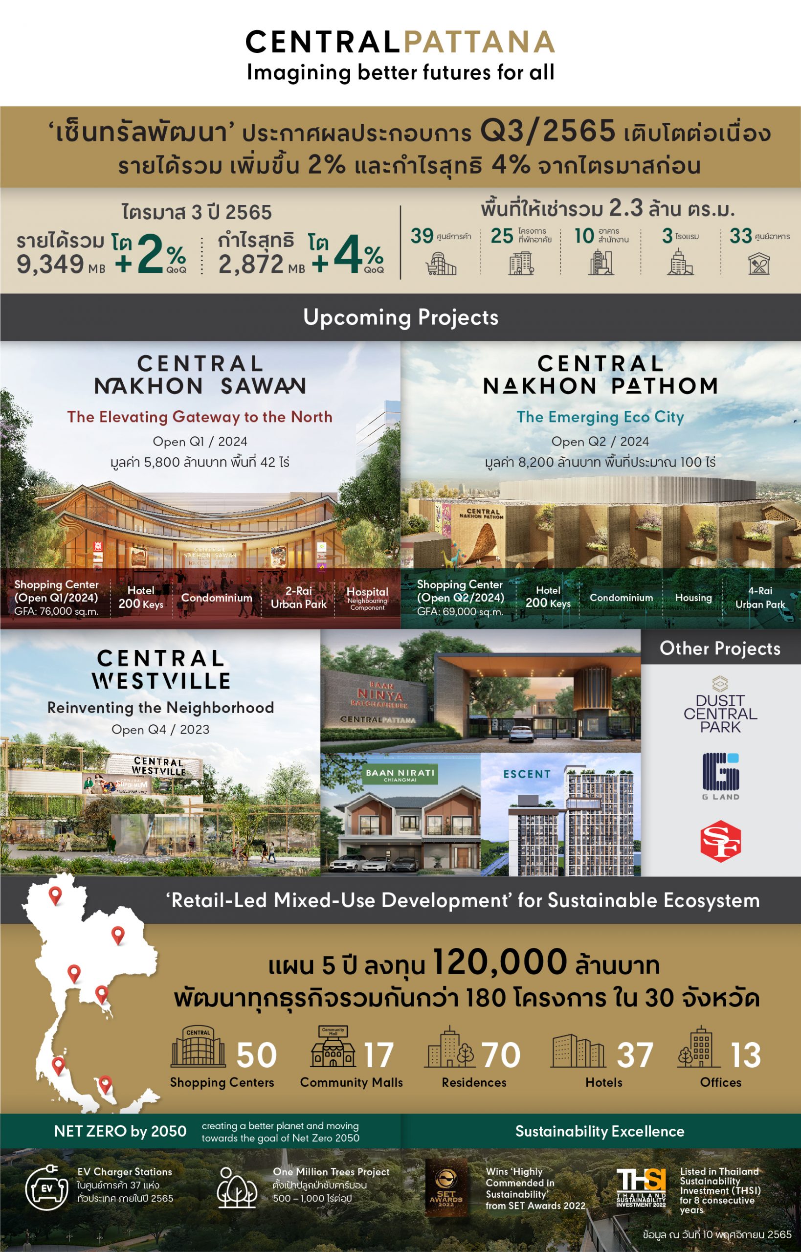 เซ็นทรัลพัฒนา รายงานผลประกอบการไตรมาส 3 ปี 2565 เติบโตอย่างแข็งแกร่ง รายได้รวม 9,349 ล้านบาท โดยเพิ่มขึ้น 83% จากปีก่อนหน้า และเพิ่มขึ้น 2% จากไตรมาสก่อน และกำไรสุทธิ 2,872 ล้านบาท เพิ่มขึ้น 1,154% จากปีก่อนหน้า และเพิ่มขึ้น 4% จากไตรมาสก่อน