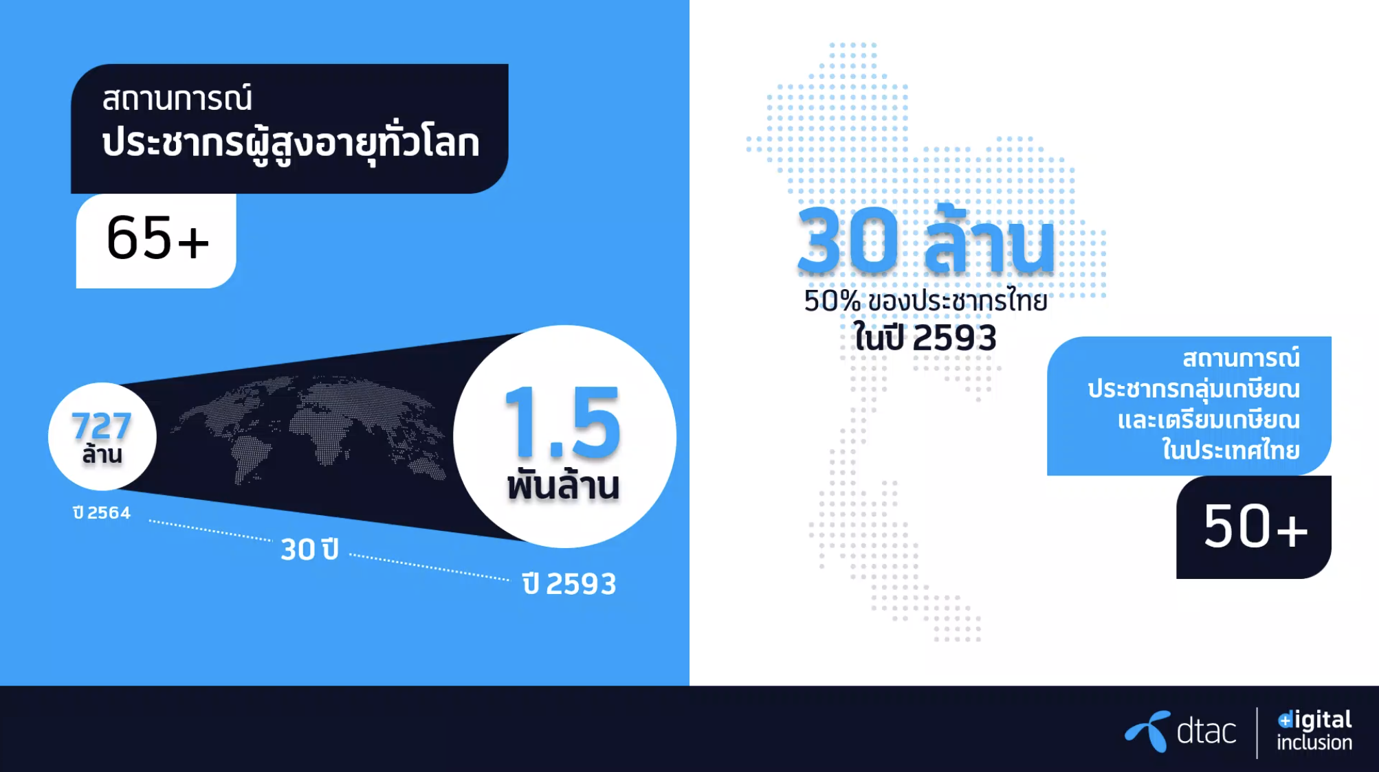 ดังนั้น ถ้าผู้สูงวัยไม่สามารถก้าวทันดิจิทัล พวกเขาจะประสบปัญหาการเข้าถึงบริการด้านสุขภาพ ธนาคาร และบริการของภาครัฐ นอกจากนี้ พวกเขายังต้องการทักษะดิจิทัลเพื่อพัฒนาการสร้างรายได้เพิ่ม ดีแทคเน็ตทำกิน จึงมุ่งมั่นที่จะปิดช่องว่างดิจิทัลที่ส่งผลกระทบต่อผู้สูงวัยในประเทศไทย”