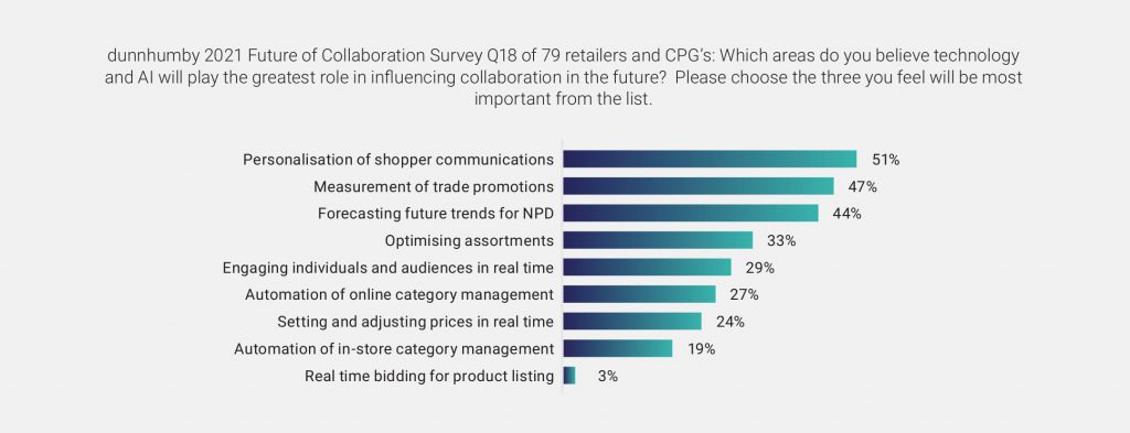 ดันน์ฮัมบี้ ได้ทำการสำรวจผู้ค้าปลีกและ CPG 80 รายจาก 15 ประเทศทั่วโลก ในหัวข้อ “2021 Future of Retailer and CPG Collaboration” เพื่อค้นหาปัจจัยใดบ้างที่จะส่งเสริมให้เกิดการทำงานร่วมกันเพื่อมอบบริการที่ดีที่สุดแก่ผู้บริโภค
