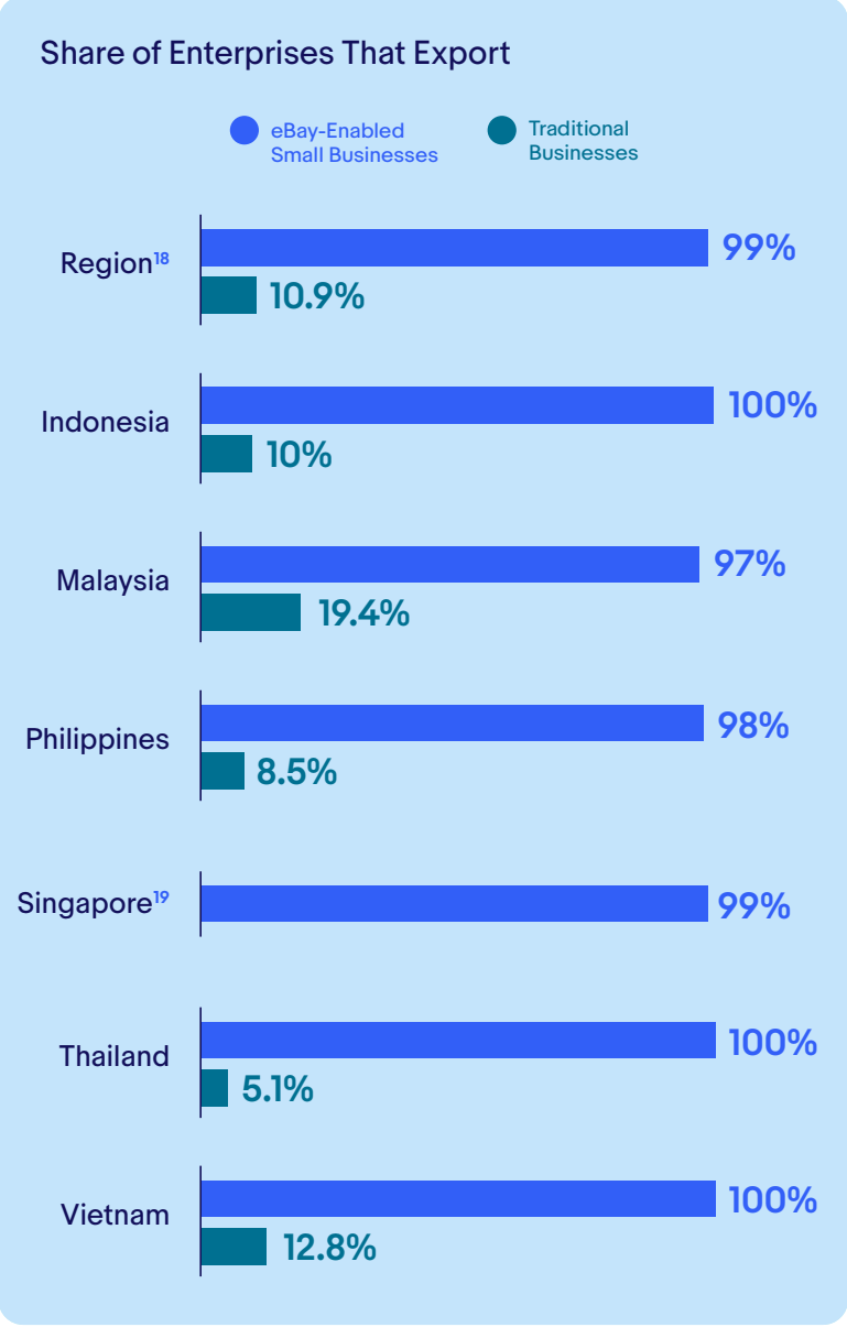 โดยรวมแล้ว กิจการขนาดเล็กบนอีเบย์ในภูมิภาคเอเชียตะวันออกเฉียงใต้ขายสินค้าไปยัง 214 ประเทศในปี 2563 ในจำนวนนี้ มีร้อยละ 64 ที่สามารถก้าวขึ้นเป็นผู้ขายระดับโลก จากการส่งออกไปทวีปต่างๆ อย่างน้อย 4 ทวีป