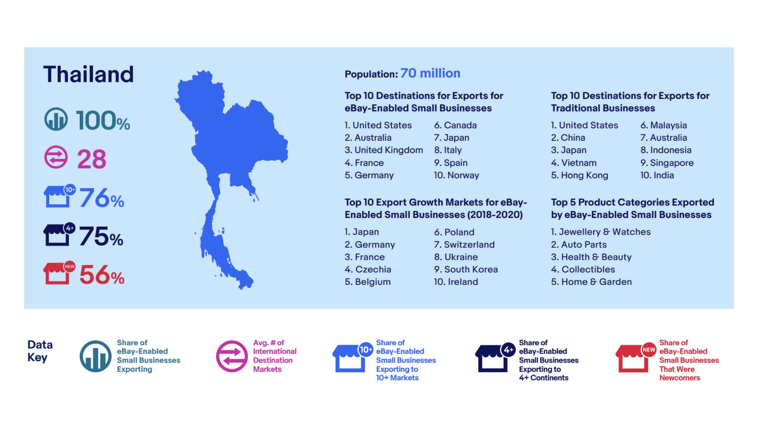 ซึ่งเอสเอ็มอีไทยประสบความสำเร็จมากกว่าอัตราเฉลี่ย โดยมีผู้ขายไทยที่เป็นกิจการขนาดเล็กบนอีเบย์ ร้อยละ 75 ขายสินค้าส่งออกไปอย่างน้อย 4 ทวีป และสัดส่วนร้อยละ 76 ที่สามารถส่งออกสินค้าไปยังมากกว่า 10 ประเทศปลายทาง