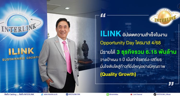 “ILINK อัปเดตความสำเร็จในงาน Opportunity Day ไตรมาส 4/68 มีรายได้ 3 ธุรกิจรวม 6.15 พันล้าน วางเป้าแผน 5 ปี เน้นกำไรแกร่ง-เสถียร มั่นใจเติบโตสู่ก้าวที่ยิ่งใหญ่อย่างมีคุณภาพ (Quality Growth)