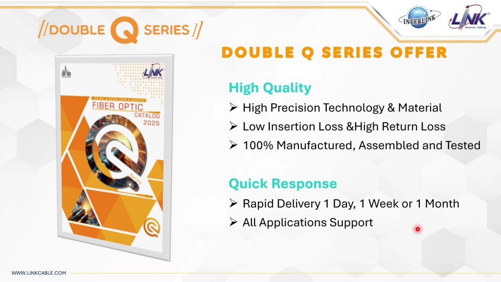DOUBLE Q SERIES คือ กลุ่มผลิตภัณฑ์ สาย Fiber Optic Pigtail, Patch Cord, Connector และ Adapter ที่พัฒนาให้มีประสิทธิภาพสูงกว่ามาตรฐาน เป็นแบบ Low Loss และ High Return Loss โดยมาในแนวคิดการออกแบบ High Quality and Quick Response