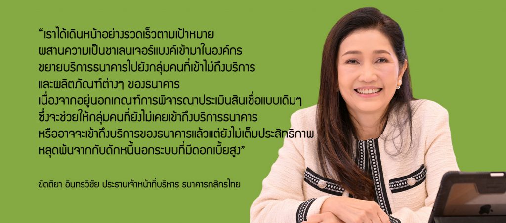 ขัตติยา อินทรวิชัย ประธานเจ้าหน้าที่บริหาร ธนาคารกสิกรไทย เปิดเผยว่า “เราอยากจะช่วยคนนับล้านๆ ให้เข้าถึงและได้รับประโยชน์จากผลิตภัณฑ์และบริการต่างๆ ของธนาคารได้ เราจึงมุ่งมั่นที่จะเป็นผู้นำทางด้านเทคโนโลยี และใช้เทคโนโลยีเพื่อที่จะสามารถบรรลุภารกิจข้างต้น รวมถึงยกระดับการให้บริการลูกค้าปัจจุบันของเราให้ดียิ่งขึ้นไปอีกด้วย”