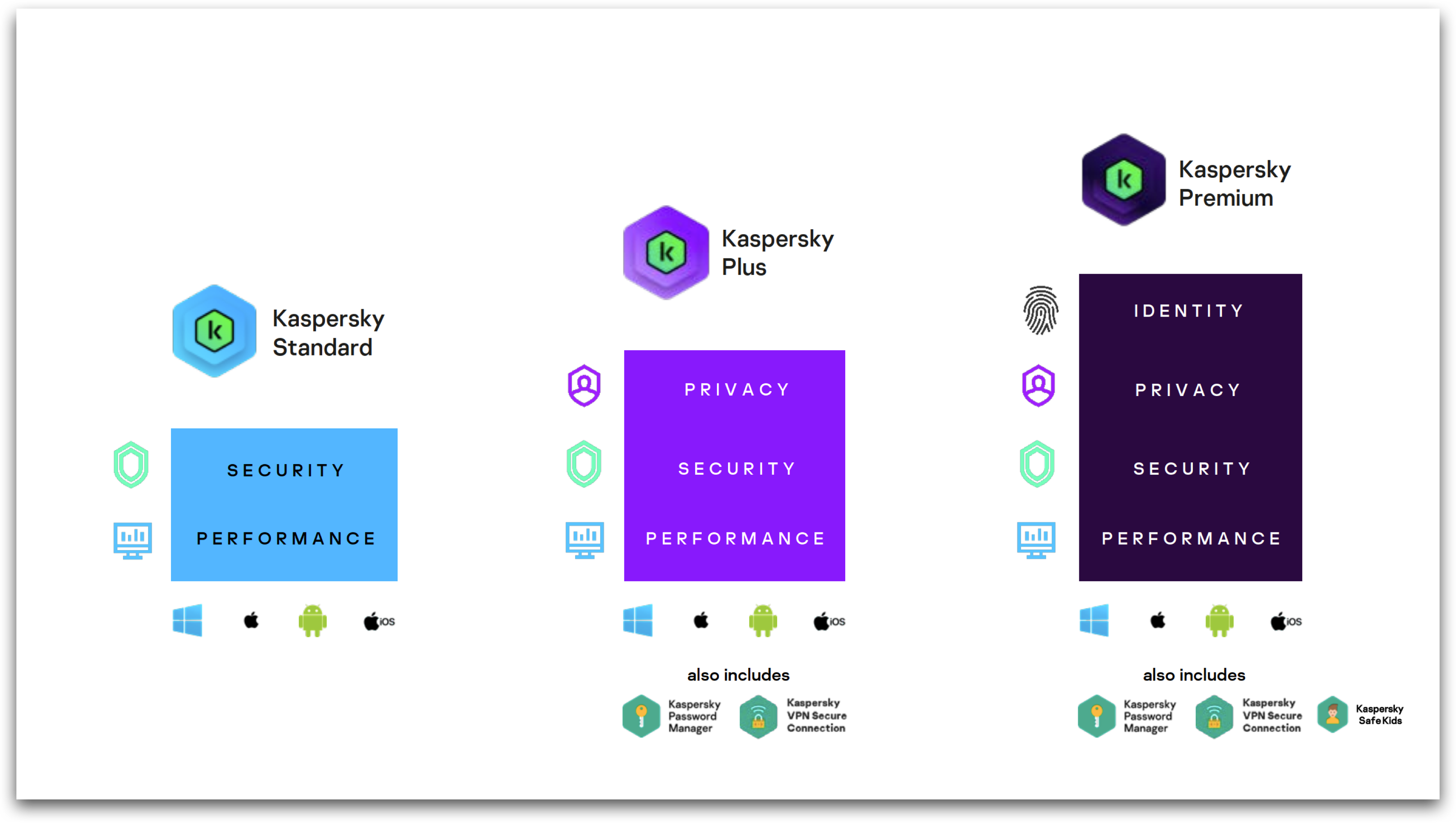 กลุ่มผลิตภัณฑ์ใหม่ที่ใช้งานง่ายนี้แบ่งออกเป็นสามแบบแผน ได้แก่ Kaspersky Standard, Kaspersky Plus และ Kaspersky Premium แผนต่างๆ ที่อัปเดตตอนนี้เป็นแบบไม่จำกัดที่แพลตฟอร์ม และทุกแผนมีการป้องกันสำหรับอุปกรณ์ประเภทต่างๆ ทั้งบน Windows, Mac, iOS และ Android ผลิตภัณฑ์ทั้งหมดนี้ออกแบบมาเพื่อสะท้อนถึงระดับของฟังก์ชันที่มีให้ผู้ใช้ในระบบนิเวศทั้งหมดของบริการสำหรับผู้บริโภคของแคสเปอร์สกี้