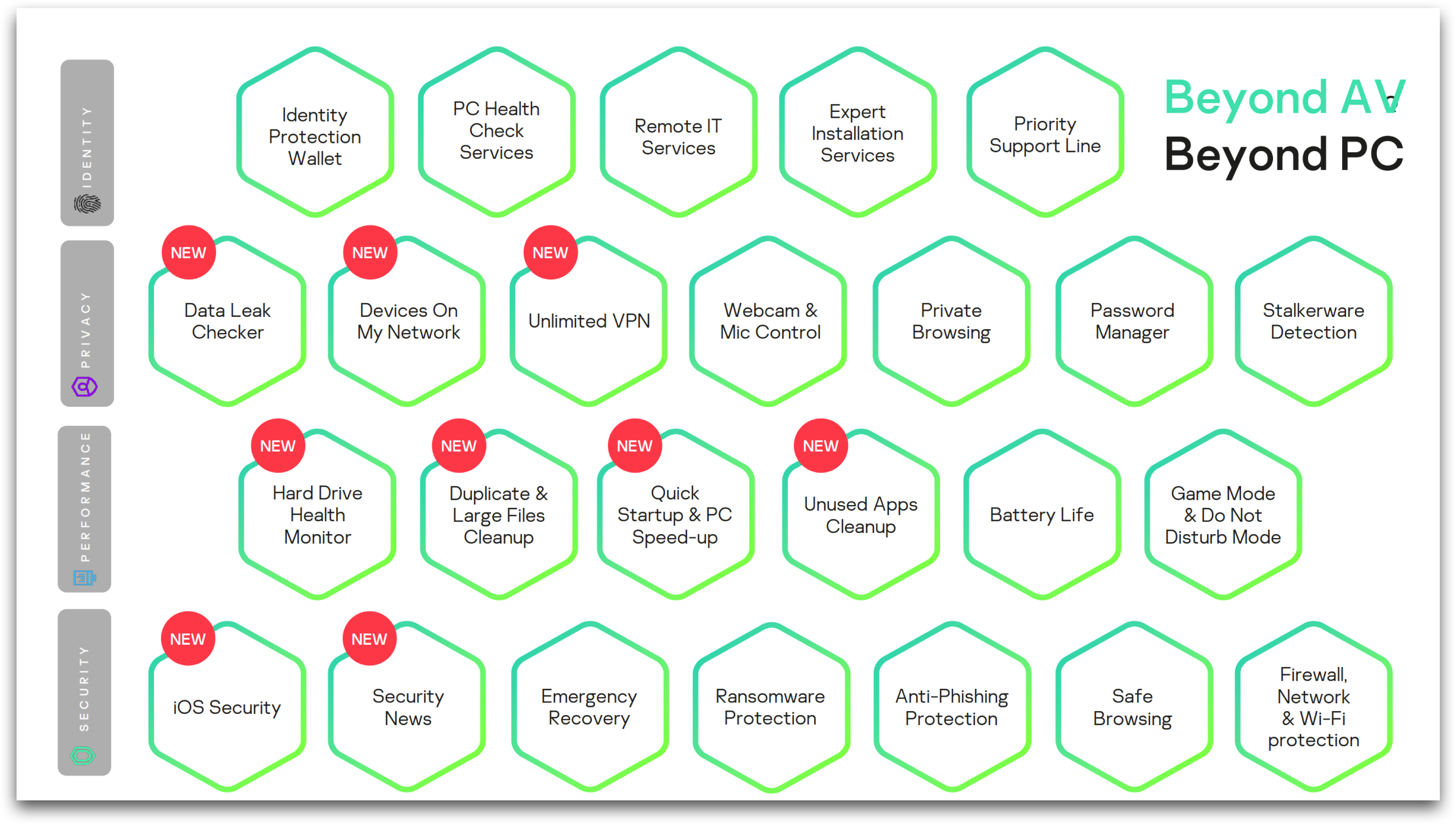 การรักษาความปลอดภัยและปกป้องความเป็นตัวตนของผู้ใช้ (Personal Security), การปกป้องข้อมูลส่วนตัว พาสเวิร์ด บัญชีการเงินและธุรกรรมดิจิทัล ที่เพิ่มเติมมากขึ้นจากโปรแกรมแอนตี้ไวรัส (Privacy on top of Antivirus protection), มีประสิทธิภาพมากขึ้นด้านความเร็วและสามารถทำงานได้บนหลากหลายแพลตฟอร์ม (Speed & Flexibility) และ ใช้งานง่าย (Easy to use features, tools and technologies)