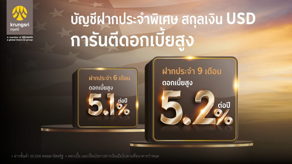“กรุงศรีลุยตลาดเงินฝาก ออก เงินฝากประจำพิเศษ สกุลเงิน USD ดอกเบี้ยสูงสุด 5.2% ต่อปี ปรับเพิ่มวงเงินฝาก กรุงศรี มีแต่ได้ ออนไลน์ เป็น 2 ล้านบาท ดอกเบี้ยสูง 1.5% ต่อปี