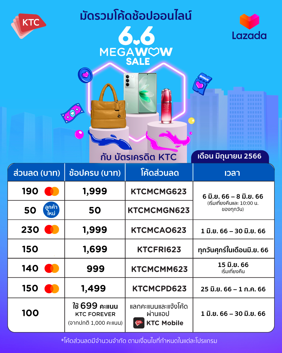โดยระบุรหัสส่วนลด KTCMCMG623 ก่อนการชำระเงิน พิเศษ สมาชิกบัตรเครดิต เคทีซีมาสเตอร์การ์ดที่ช้อปออนไลน์ครั้งแรกกับ Lazada ผ่านแอปฯ Lazada รับส่วนลดทันที 50 บาท โดยระบุรหัสส่วนลด KTCMCMGN623 ก่อนชำระเงิน”