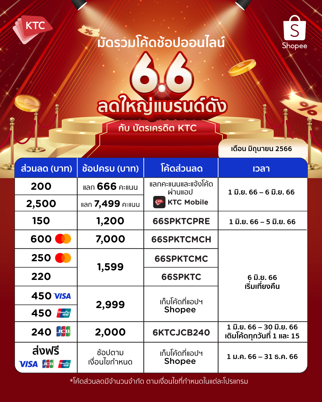 หรือแลกรับโค้ดส่วนลด 2,500 บาท เมื่อใช้ 7,499 คะแนน KTC FOREVER โดยโค้ดส่วนลดสามารถใช้ได้ที่แอปฯ ช้อปปี้ ถึงวันที่ 30 มิถุนายน 2566 พิเศษ รับโค้ดส่วนลดสูงสุด 600 บาท เมื่อช้อปครบตามเงื่อนไขที่กำหนด ระหว่างวันที่ 1 – 6 มิถุนายน 2566”