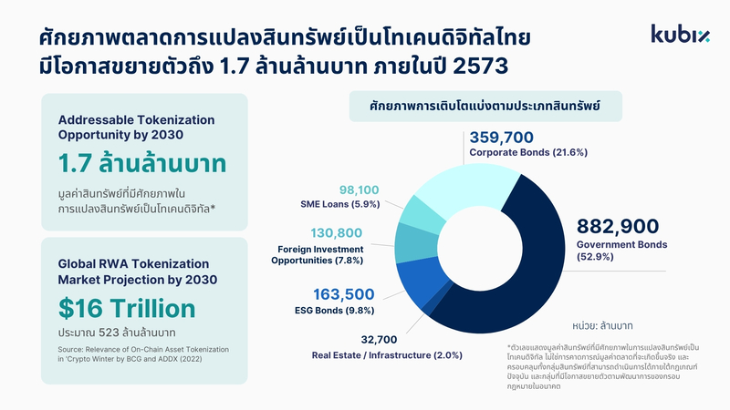 การยกระดับการแปลงสินทรัพย์ในโลกจริงเป็นโทเคนดิจิทัลในระดับสถาบัน เพื่อวิเคราะห์ศักยภาพและทิศทางการเติบโตของตลาดการแปลงสินทรัพย์เป็นโทเคนดิจิทัลในประเทศไทย คาดมีมูลค่าโอกาสทางเศรษฐกิจสูงถึง 51,000 ล้านดอลลาร์สหรัฐ หรือราว 1.7 ล้านล้านบาท ภายในปี 2573