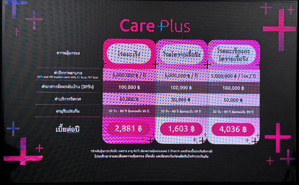 เมืองไทยประกันชีวิต พลัสความแคร์ให้คนที่แคร์แต่คนอื่น เปิดตัว “แคร์พลัส (Care Plus)” ความคุ้มครองค่ารักษาโรคมะเร็ง และไตวายเรื้อรัง ให้คุณคลายกังวลเรื่องค่ารักษาพยาบาลที่สูงและต่อเนื่อง ด้วยความคุ้มครองที่ครอบคลุมทั้ง IPD และ OPD วงเงินสูง 5 ล้านบาทต่อโรคต่อปี เลือกความคุ้มครองได้ตามต้องการค่าเบี้ยประกันภัยเข้าถึงได้ช่วยให้คุณเข้าถึงการรักษาด้วยนวัตกรรมแบบทันสมัย และช่วยเพิ่มโอกาสหายให้มากขึ้น