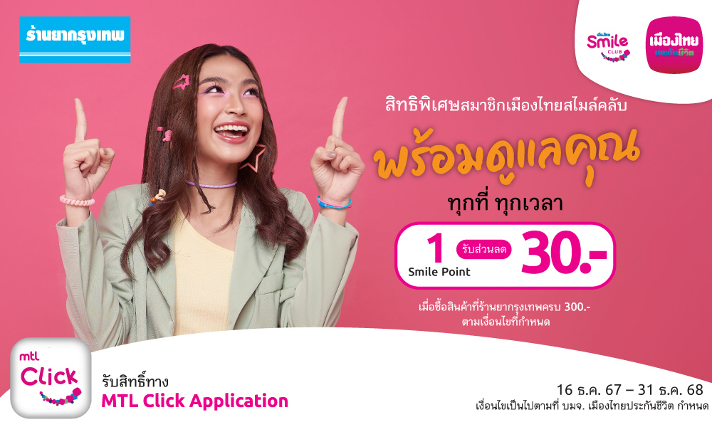 สมาชิกเมืองไทยสไมล์คลับใช้คะแนนสะสม 1 Smile Point รับ E-Coupon 30 บาท เมื่อซื้อสินค้าครบ 300 บาท / ใบเสร็จ ที่ ร้านยากรุงเทพ ทุกสาขา จำกัดจำนวนการแลก 5 สิทธิ์ / 1 ท่าน / วัน E-Coupon สามารถสแกนใช้ได้ 1 ครั้งต่อ 1 ใบเสร็จเท่านั้น รับสิทธิ์ทางแอปพลิเคชัน MTL Click แสดง Barcode ณ จุดชำระเงินร้านยากรุงเทพ ภายใน 30 นาที