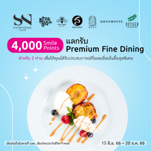 • Premium Fine Dining รับบริการมื้ออาหารสุดพิเศษ จาก 7 ร้านอาหารชั้นนำที่มีเชฟชื่อดังรังสรรค์เมนูสุดพิเศษ ทำให้แต่ละมื้ออาหารในแต่ละร้านมีสไตล์อาหารและเอกลักษณ์เฉพาะตัวแบบไม่เหมือนใคร โดยสมาชิกฯ ใช้ 4,000 Smile Points แลกรับสิทธิ์สำหรับ 2 ท่าน