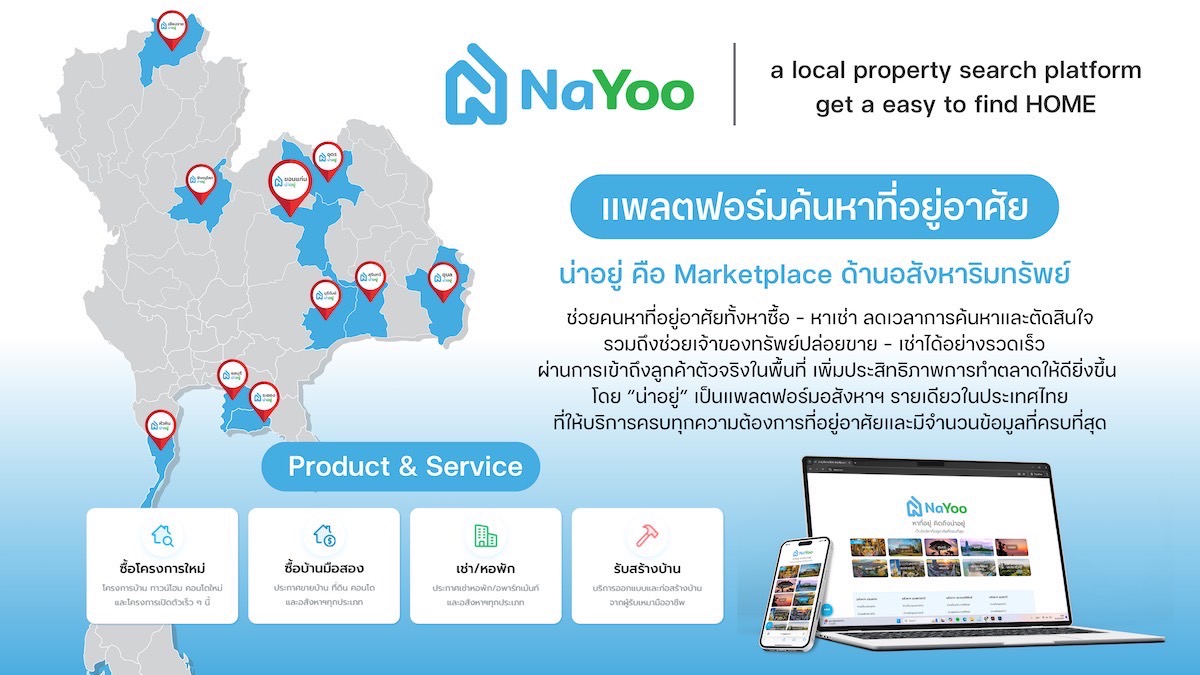 น่าอยู่ สตาร์ทอัพแพลตฟอร์มมาร์เก็ตเพลสด้านอสังหาริมทรัพย์สัญชาติไทย (www.NaYoo.co) ผู้ให้บริการซื้อ-ขาย, เช่า, แบบบ้าน-รับสร้างบ้าน ครบจบในที่เดียว ประกาศความสำเร็จระดมทุนรอบพรี ซีรีส์ A มูลค่ามากกว่า 40 ล้านบาท ผ่านความร่วมมือกับสองพันธมิตรยักษ์ใหญ่ NVEST Venture กองทุนภายใต้ธนาคารออมสินและตลาดหลักทรัพย์แห่งประเทศไทย และบริษัท ออลคอนวัน จำกัด (Allkons One) แพลตฟอร์มซื้อ-ขายวัสดุก่อสร้าง