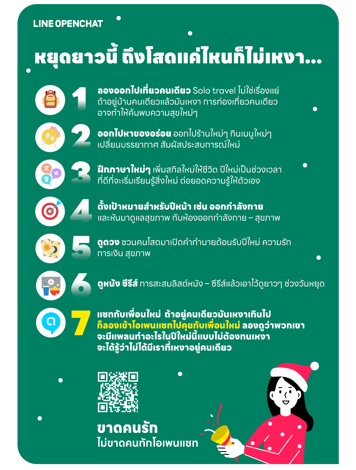 เราเลยอยากมาแนะนำ 7 กลุ่มห้องโอเพนแชทชวนเหล่าคนโสดทุกหมู่เหล่า ไม่ว่าจะโสดมืออาชีพ โสดขี้เหงา โสดอินโทรเวิร์ท หรือโสดเอ็กซ์โทรเวิร์ท ให้มาจอยกันแบบ “ขาดคนรัก ไม่ขาดคนทัก” ได้เรียลไทม์ตลอด 24 ชม. รับวันหยุดยาวเคาท์ดาวน์สิ้นปีนี้