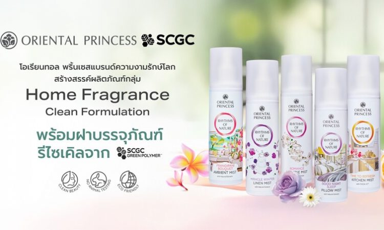สำหรับการนำพลาสติกใช้แล้วมารีไซเคิลผลิตเป็นฝาบรรจุภัณฑ์จากเม็ดพลาสติกรีไซเคิลคุณภาพสูง (High Quality PCR Resin) ของโอเรียนทอล พริ้นเซส ในครั้งนี้ เป็นผลิตภัณฑ์ในกลุ่ม Home Fragrance ซีรีส์ “Rhythms of Nature” ทั้ง 14 รายการ ได้แก่ Rhythms of Nature Linen Mist ผลิตภัณฑ์ฉีดผ้าหอมจำนวน 6 SKUs, Rhythms of Nature Lingerie Mist สเปรย์ฉีดชุดชั้นในจำนวน 2 SKUs, Rhythms of Nature Ambient Mist สเปรย์ฉีดห้อง 4 SKUs, Rhythms of Nature Kitchen Mist 1 SKU สเปร์น้ำหอมสำหรับห้องครัว และ Rhythms of Nature Pillow Mist สเปรย์ฉีดหมอน 1 SKU
