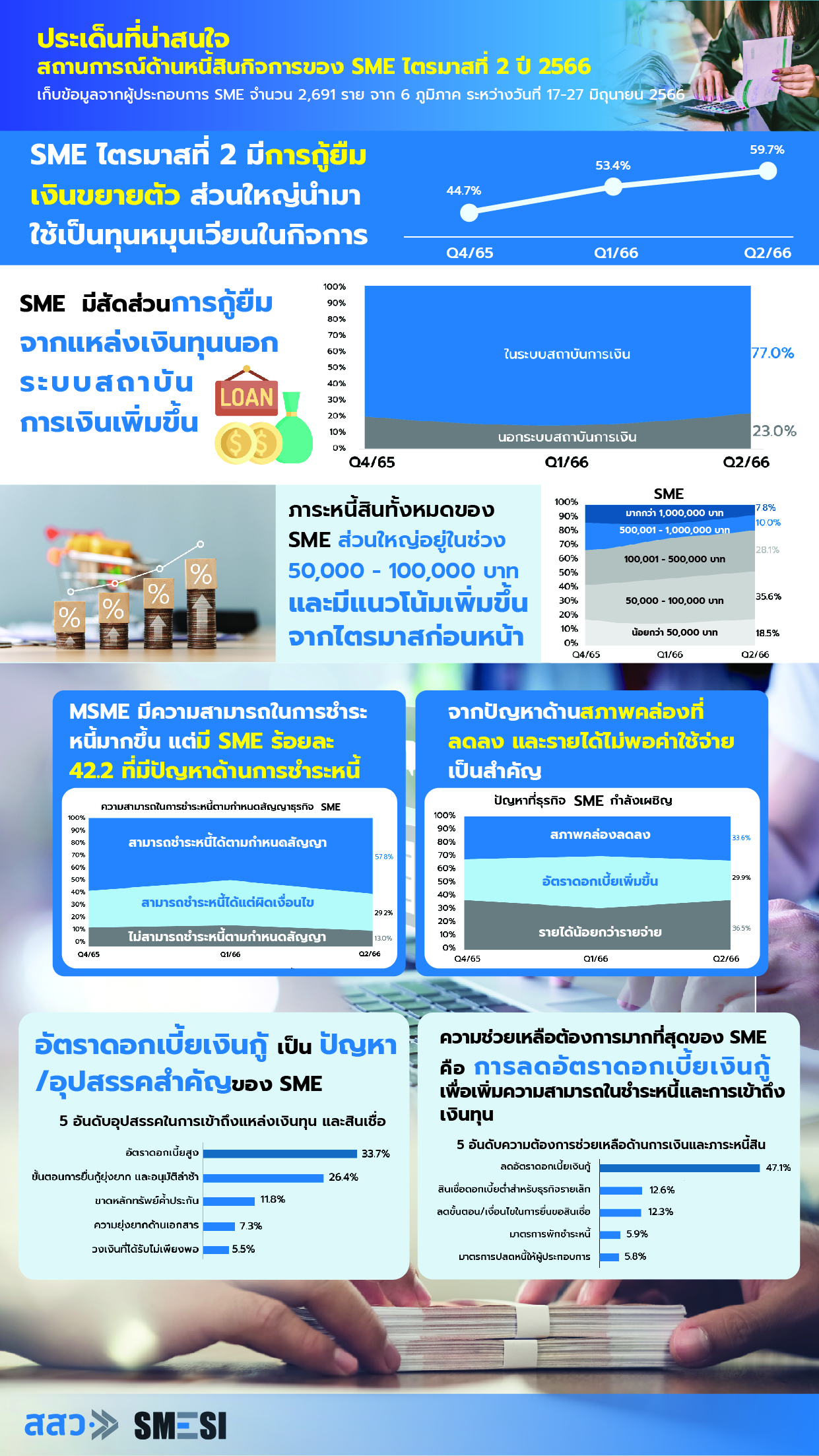 สำนักงานส่งเสริมวิสาหกิจขนาดกลางและขนาดย่อม (สสว.) เผยผลสำรวจสถานการณ์หนี้สินกิจการ SME ไตรมาสที่ 2 ปี 2566 พบผู้ประกอบการถึงร้อยละ 59.7 มีภาระหนี้สินซึ่งเพิ่มขึ้นจากไตรมาสที่ 1 ปี 2566 ที่ร้อยละ 53.4 ส่วนใหญ่กู้ยืมเงินเพื่อใช้หมุนเวียนในกิจการ