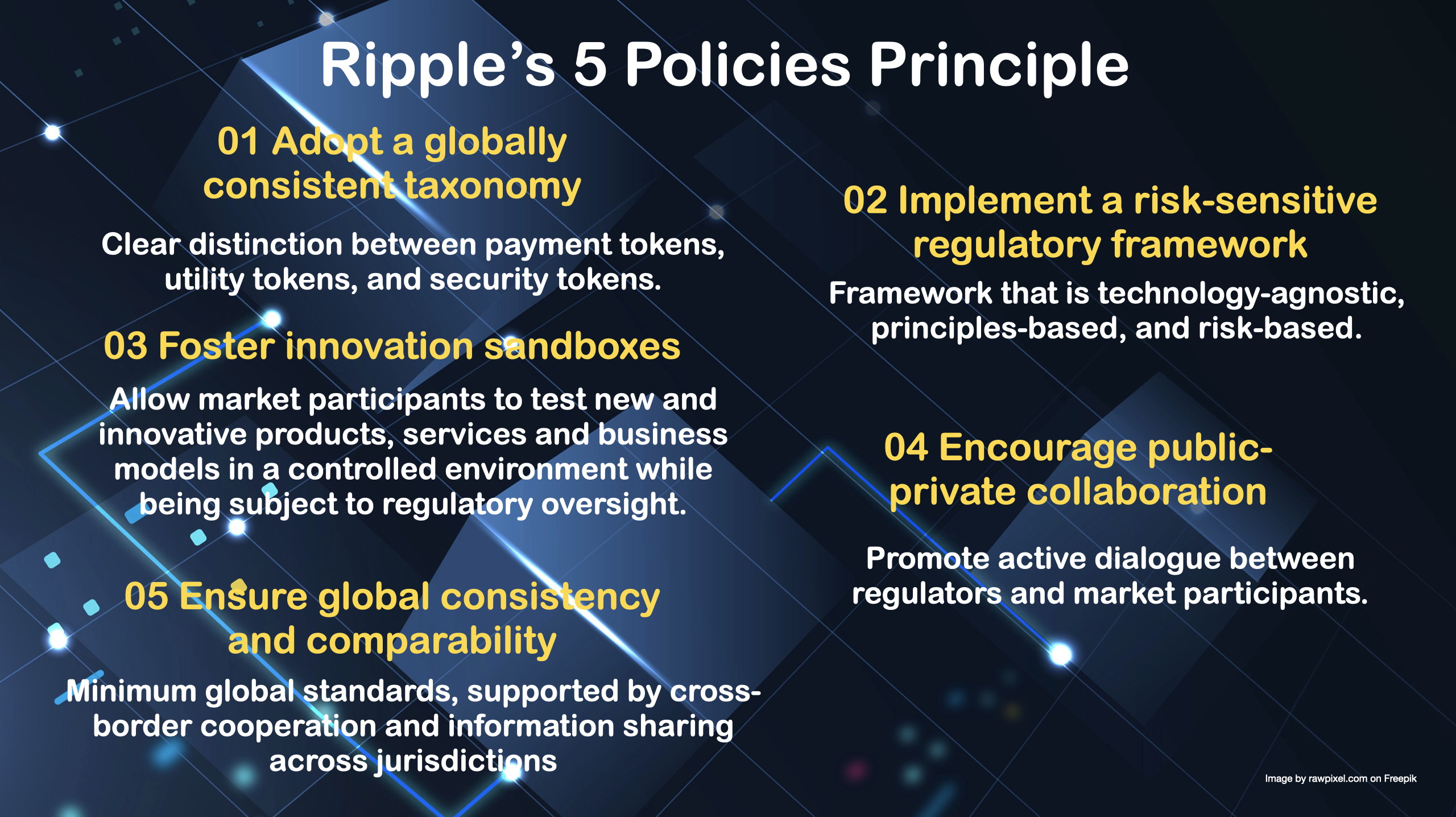 “ดังนั้นเพื่อสนับสนุนหน่วยงานกำกับดูแล_Ripple จึงได้พัฒนาสิ่งที่เราเรียกว่า หลักการนโยบายสำหรับตลาดสินทรัพย์ดิจิทัล 5 ประการ ประกอบด้วย”