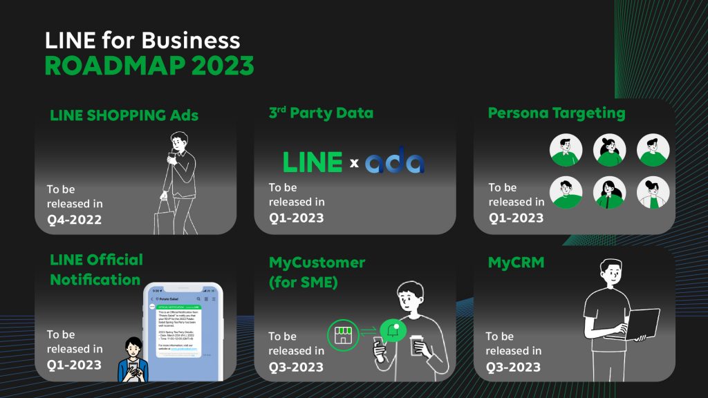 เมื่อเร็วๆ นี้ ภายในงาน LINE THAILAND BUSINESS 2022 จัดโดย LINE for Business ได้ประกาศโร้ดแมป การพัฒนาโซลูชั่นธุรกิจบน LINE ปี 2023 ที่จะเน้นการพัฒนาเครื่องมือที่ช่วยให้แบรนด์ได้รู้จักและรู้ใจลูกค้ามากขึ้นด้วยดาต้า สามารถเชื่อมต่อแบรนด์กับลูกค้าตลอดเส้นทางของการช้อปปิ้ง ตั้งแต่สร้างการรับรู้ (Awareness) สร้างความสนใจ (Interest) กระตุ้นความต้องการ (Desire) ปิดการขายได้ (Action) และรักษาฐานลูกค้า (Retain) ไว้กับแบรนด์ให้นานที่สุด
