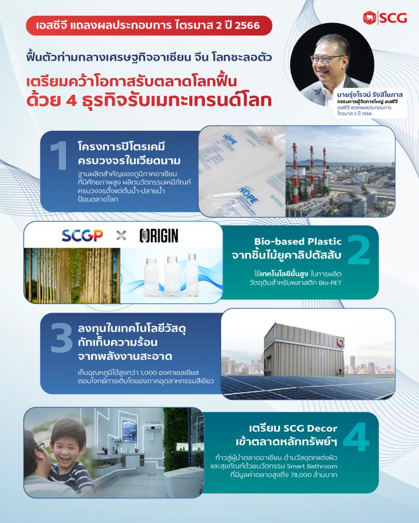 ผลประกอบการเอสซีจี ไตรมาส 2 ปี 2566 ฟื้นตัวจากการเร่งปรับตัวตามแผนงาน ท่ามกลางเศรษฐกิจอาเซียน จีน โลกชะลอตัว เตรียมคว้าโอกาสรับตลาดโลกฟื้นด้วย 4 ธุรกิจรับเมกะเทรนด์โลก โครงการปิโตรเคมีครบวงจรใหญ่สุดในเวียดนามผลิตเม็ดพลาสติกคุณภาพสูงป้อนตลาดในภูมิภาค – Bio-based Plastic จากชิ้นไม้ยูคาลิปตัสสับ ย่อยสลายได้ – วัสดุกักเก็บความร้อนจากพลังงานสะอาดสำหรับอุตสาหกรรมลดคาร์บอน – SCG Decor ปักธงเบอร์ 1 ในอาเซียน