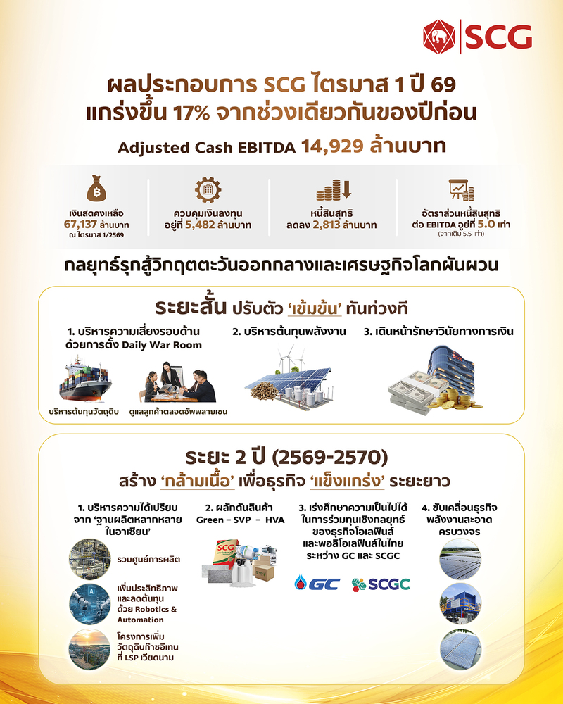 ลประกอบการ SCG ไตรมาส 1 ปี 2569 มี Adjusted Cash EBITDA 14,929 ล้านบาท แกร่งขึ้น 17% จากช่วงเดียวกันของปีก่อน คาดสถานการณ์ตะวันออกกลางทำเศรษฐกิจโลกชะลอ ราคาพลังงาน วัตถุดิบผันผวนต่อ เร่งกลยุทธ์ ระยะสั้น บริหารต้นทุนวัตถุดิบ พลังงาน ดูแลลูกค้าต่อเนื่อง ด้วย Daily War Room ปรับตัวทันท่วงที