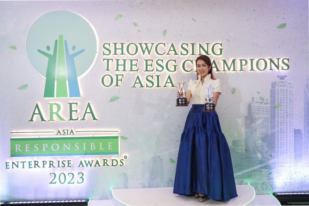 มณีสุดา ศิลาอ่อน ประธานเจ้าหน้าที่สำนักพัฒนาความยั่งยืนและสื่อสารองค์กร บริษัท เอส แอนด์ พี ซินดิเคท จำกัด (มหาชน) รับมอบรางวัลระดับเอเชียในพิธีมอบรางวัล Asia Responsible Enterprise Awards 2023 (AREA)
