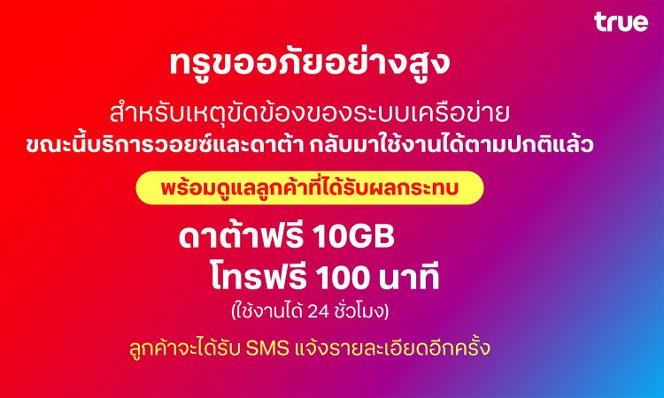 ทรูขออภัยลูกค้าเป็นอย่างสูงและแจงบริการสามารถกลับมาใช้งานได้ตามปกติแล้ว