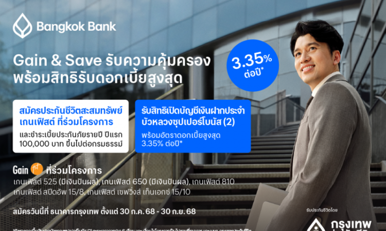 กรุงเทพประกันชีวิต ผนึกธนาคารกรุงเทพ สานต่อโครงการ Gain & Save เฟส 2 มอบความคุ้มครองชีวิต พร้อมสิทธิ์ดอกเบี้ยเงินฝากสูงสุด 3.35% ต่อปี ตอบโจทย์การวางแผนการเงินในยุคเศรษฐกิจผันผวน