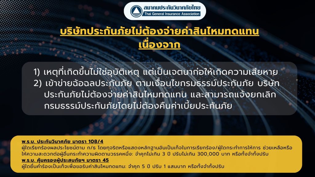 ทั้งนี้ รวมถึงกรณีที่มีกลุ่มคนตระเวนซื้อกรมธรรม์ประกันภัยเป็นจำนวนหลายฉบับจากหลายบริษัท การกระทำในลักษณะนี้ถือว่าไม่ใช่การบริหารความเสี่ยงภัยของตัวเอง แต่เป็นการแสวงหาประโยชน์โดยมิชอบ ซึ่งกลุ่มคนที่มีความคิดและกระทำเช่นนี้ถือว่าเป็นการกระทำทุจริตในการฉ้อฉลประกันภัย สมาคมฯ จึงขอเตือนกลุ่มคนที่กระทำการในลักษณะนี้ว่า การประกันภัยจะให้ความคุ้มครองเฉพาะผู้เอาประกันภัยที่ใช้สิทธิโดยสุจริตเท่านั้น หากพิสูจน์ได้ว่าใช้สิทธิโดยไม่สุจริตมาทำประกันภัย เป็นการกระทำที่ผิดกฎหมายและจะไม่ได้รับค่าสินไหมทดแทนตามสัญญาประกันภัยแน่นอน