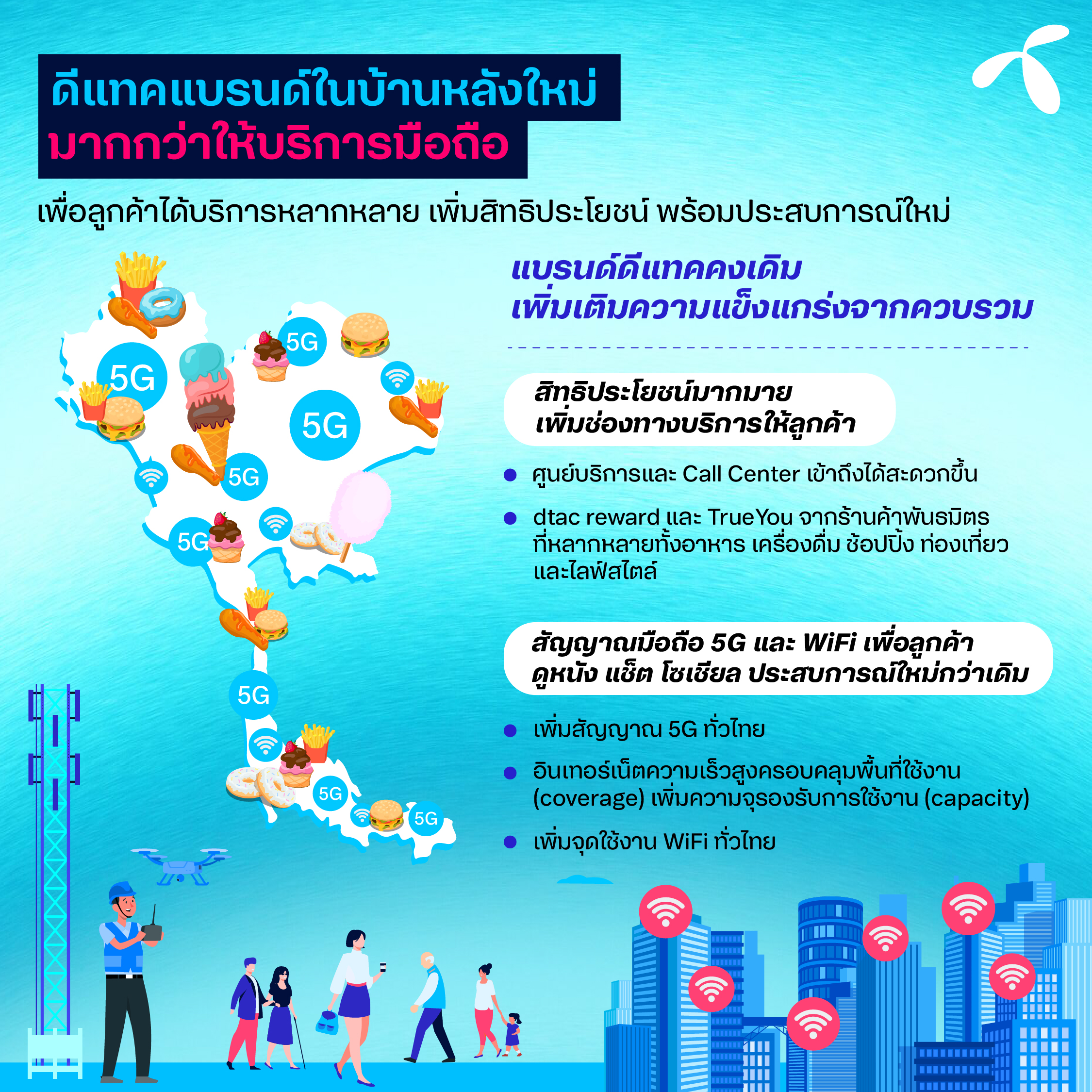 แบรนด์ ดีแทค ในบ้านใหม่จะเพิ่มสัญญาณ 5G และอินเทอร์เน็ตความเร็วสูงครอบคลุมพื้นที่ใช้งาน (coverage) และเพิ่มความจุรองรับการใช้งาน (capacity) และเพิ่มจุดใช้งาน Wi-Fi สามารถเชื่อมต่อการใช้งานในอาคาร ศูนย์การค้า พื้นที่สาธารณะต่างๆ นอกเหนือจากสัญญาณคุณภาพ 5G และ 4G ถ้าควบรวมสู่บริษัทใหม่เสร็จสิ้น ลูกค้าดีแทคไม่ว่าจะอยู่ในเมือง นอกเมือง พื้นที่ห่างไกล หรือ ไม่ว่าจะเป็นใคร ทั้ง คนทั่วไป นักเรียน นักธุรกิจ พ่อค้า แม่ค้า เกษตรกร จะได้รับประโยชน์ร่วมกัน