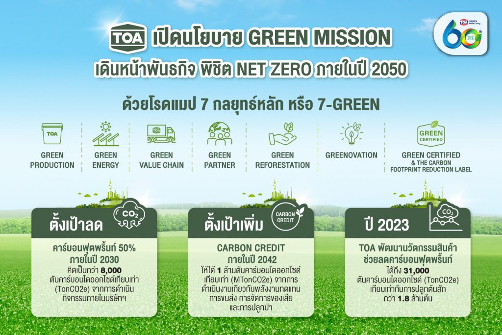 บริษัท ทีโอเอ เพ้นท์ (ประเทศไทย) จำกัด (มหาชน) หรือ TOA เปิดแผนนโยบาย GREEN MISSION ตอกย้ำผู้นำเบอร์หนึ่งตลาดสีอาคารและวัสดุก่อสร้างครบวงจร ด้วยโรดแมปพิชิต Net Zero อย่างเป็นรูปธรรม ภายในปี 2050 เพื่อบูรณาการองค์กรยั่งยืนตามหลัก ESG เสริมแกร่งความสำเร็จกับการคว้าฉลากลดคาร์บอนฟุตพริ้นท์ หรือฉลากลดโลกร้อน (CFR) มากที่สุดในสีอาคาร รวม 40 ผลิตภัณฑ์ พร้อมเติบโตสู่ปีที่ 60 อย่างแข็งแกร่ง