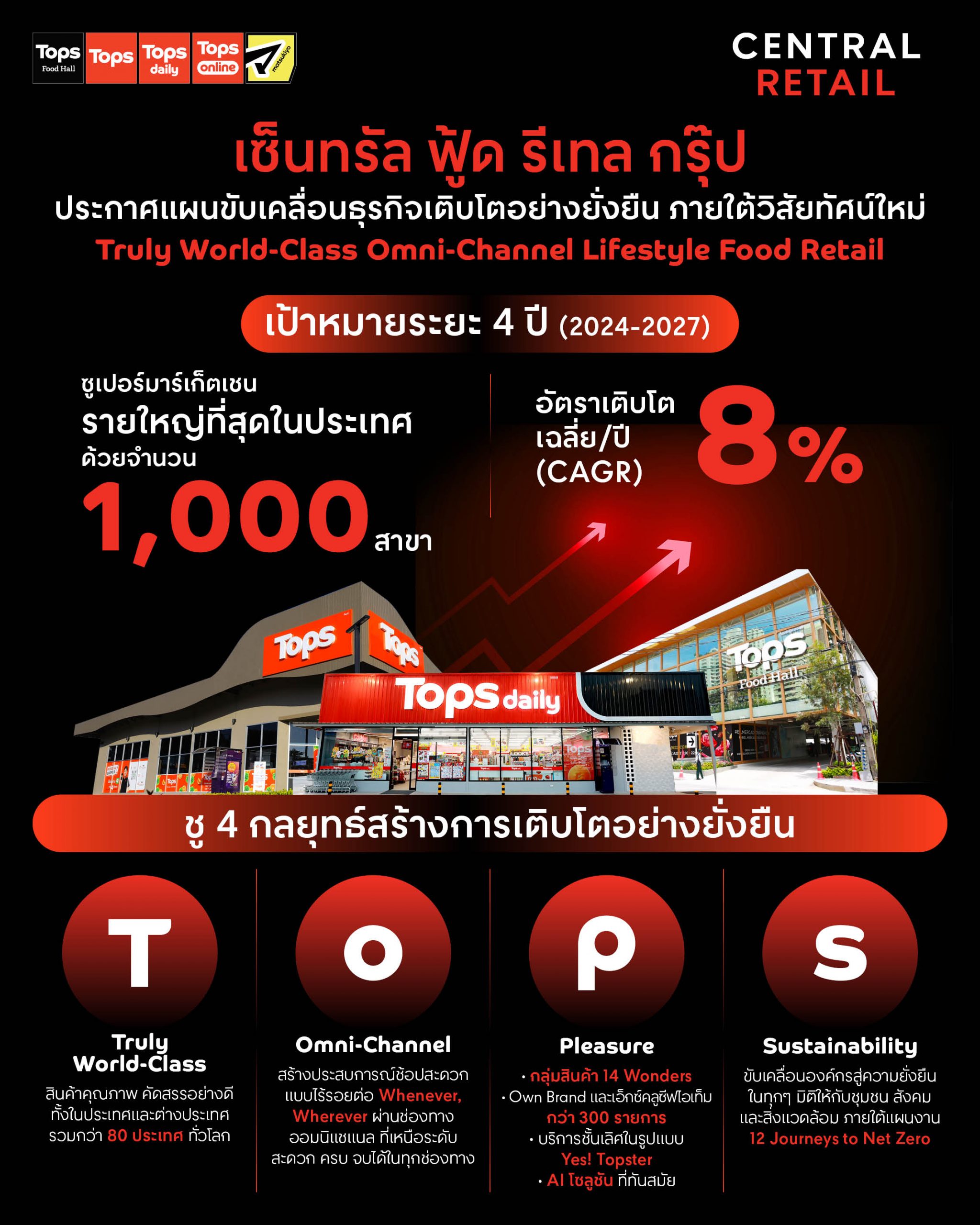 “เซ็นทรัล ฟู้ด รีเทล กรุ๊ป ฉลองครบรอบ 28 ปี ท็อปส์ ประกาศวิสัยทัศน์ใหม่ Truly World-Class Omni-Channel Lifestyle Food Retail ตั้งเป้าครองตำแหน่งซูเปอร์มาร์เก็ตเชนรายใหญ่ที่สุดในประเทศ ด้วยสาขากว่า 1,000 แห่งภายในปี พ.ศ. 2570 ย้ำภาพผู้นำเบอร์ 1 ธุรกิจฟู้ดรีเทลเมืองไทย