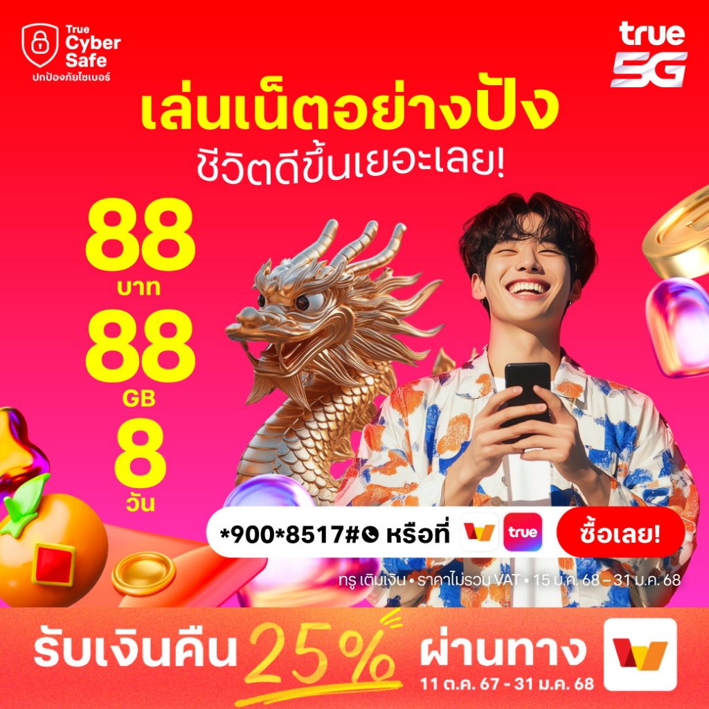 • ลูกค้าทรู ดีแทค เติมเงิน เฮงเต็มสปีดกับ เน็ตเต็มสปีด 88 GB 88 บาท ใช้ได้ 8 วัน ตั้งแต่ 15 – 31 ม.ค. 68 พร้อมรับเงินคืน 25% ผ่านทรูมันนี่แอป ฯ
