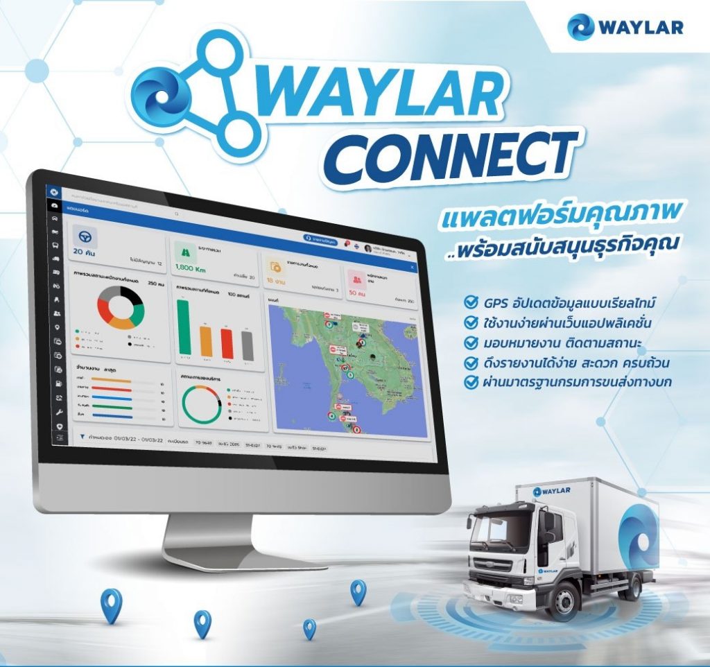 - WAYLAR CONNECT: เว็บแอปพลิเคชันสำหรับบริหารและติดตามสถานะของยานพาหนะ บุคคล และงาน โดยระบบจะแสดงสถานะข้อมูลที่เป็นปัจจุบันมากที่สุด พร้อมจัดเก็บข้อมูลอย่างเป็นระบบ สามารถดึงรายงานย้อนหลังเพื่อนำมาใช้ในการวิเคราะห์วางแผนการดำเนินงานธุรกิจได้