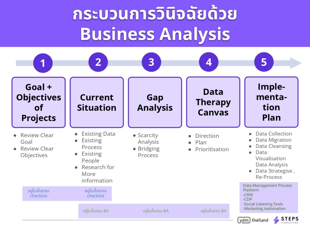 คำถามดังกล่าวจะช่วยให้แบรนด์พบปัญหาได้ และสามารถวินิจฉัยโรคหรือ ปัญหา และสาเหตุของปัญหาที่แบรนด์มีได้ชัดเจนขึ้นโดยกระบวนการวินิจฉัยด้วย Business analysis มี 5 ขั้นตอน